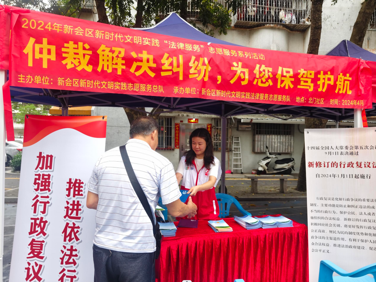 新修订的《中华人民共和国行政复议法》将于今年1月1日起施行。为贯彻实施新行政复议法,充分发挥行政复议制度在化解行政争议、构建法治政府、维护社会稳定等方面的重要作用,同时,为进一步提高仲裁法的认知度,充分发挥仲裁在化解民商事和知识产权纠纷中的作用,近日,区司法局在会城街道开展行政复议法暨仲裁法宣传活动。