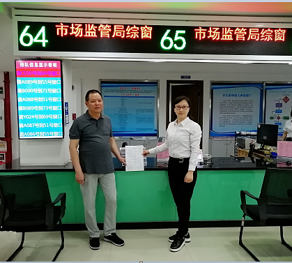 2021年4月8日下午,区统计局法规执法股负责人陈兆昌(左)将《依法统计告知书》交区市场监督管理局四级主任科员伍英峰(右)在市场监管局综窗(涵盖税务登记流程)向企业、个体工商户办理营业执照时发放。