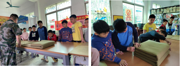 除了开展“思政教育课堂”,退役军人邓叔还组织孩子们现场体验军营中的被子叠法,倾囊相授叠“豆腐块”的秘诀。孩子们聚精会神地倾听和观察,一丝不苟地付诸实践,从叠被子中体会军人严谨生活作风,做到内化于心、外化于行。