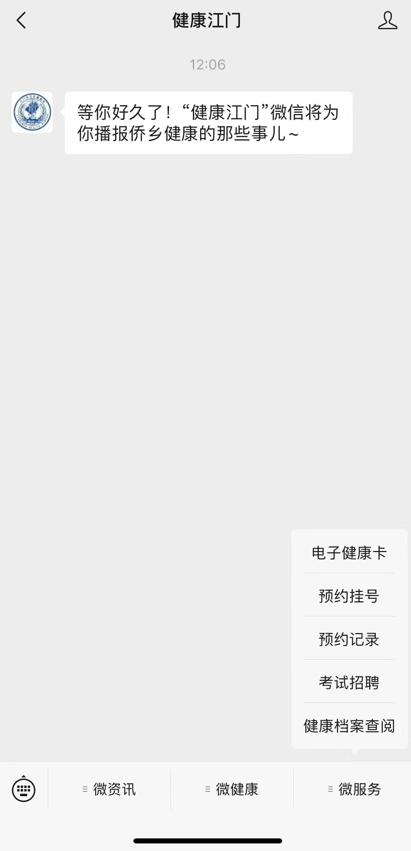 (1) 微信关注“健康江门”公众号,在界面右下角“微服务”中,点击“电子健康卡”;