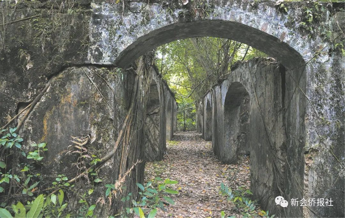 在圭峰山五坑的树林里,隐藏着一座被人遗忘的旧建筑,厚实的断壁残垣,诉说着岁月的荒凉。这是新会“四变”时期留下的一座富有时代色彩的“逼拱”式建筑,可惜没有在新会建筑史上留下浓墨重彩的记载。历经60多年的风风雨雨,往事浮光,最闪亮的印记就是留下了周总理1958年到此视察的足迹。