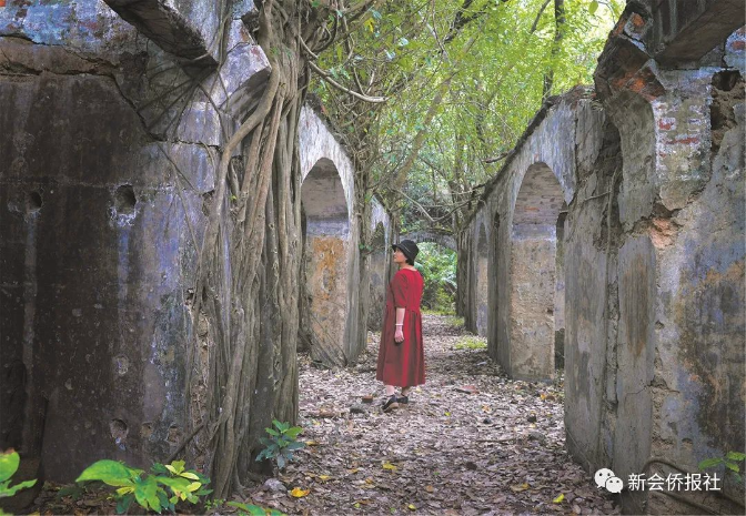 灰蒙蒙的天色,为这座隐蔽于绿树丛中的老建筑添上几分神秘。一道道红砖拱顶横跨于厚厚的泥墙之上,依然可见老建筑的规模与气势。遍地落叶堆积,铺满了废墟的荒芜,断壁盘根如网,弥漫着岁月的况味。浓荫蔽地,长长的廊道犹显幽深迷离。无论横看竖看,都成行成排,呈现着中国人所崇尚的对称之美。一道拱凝望着另一道拱,一面墙守护着另一面墙,一扇窗呼唤着另一扇窗。