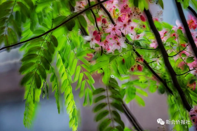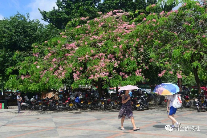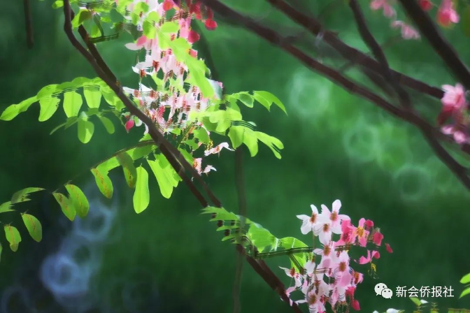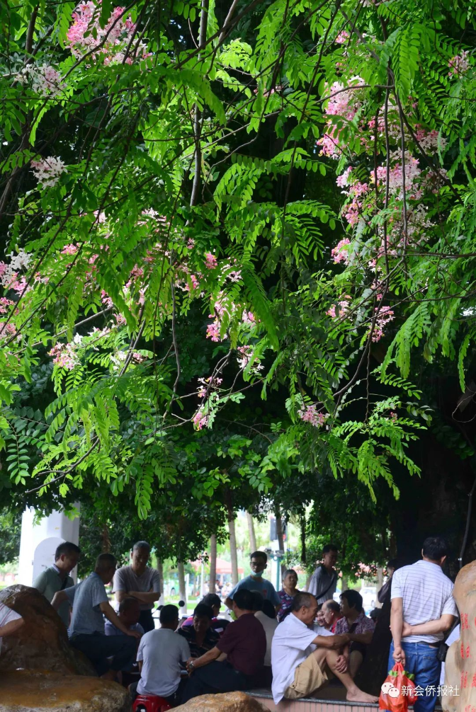 平日,记者上班路过冈州广场外围,甚少在里边逗留。这次来到,才发现早晨的冈州广场原来好美:抬眼望去一棵棵高大挺拔的树被朝阳笼罩着,像披了一层金色的纱;近处,五颜六色的花朵在绿得发亮的叶子烘托下,显得明艳动人;而在树上的鲜花也不甘示弱,与地面的花朵争妍斗丽,散发出沁人心脾的芳香。